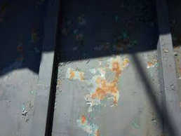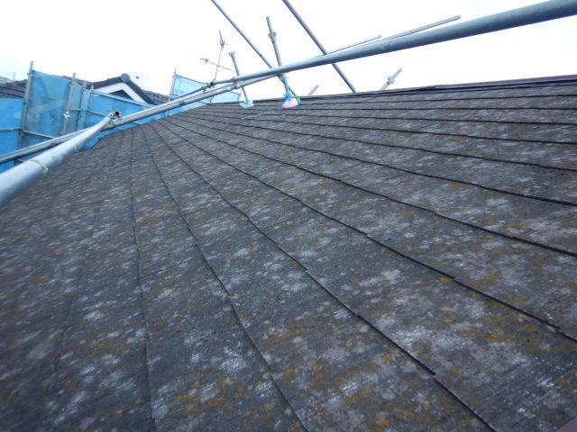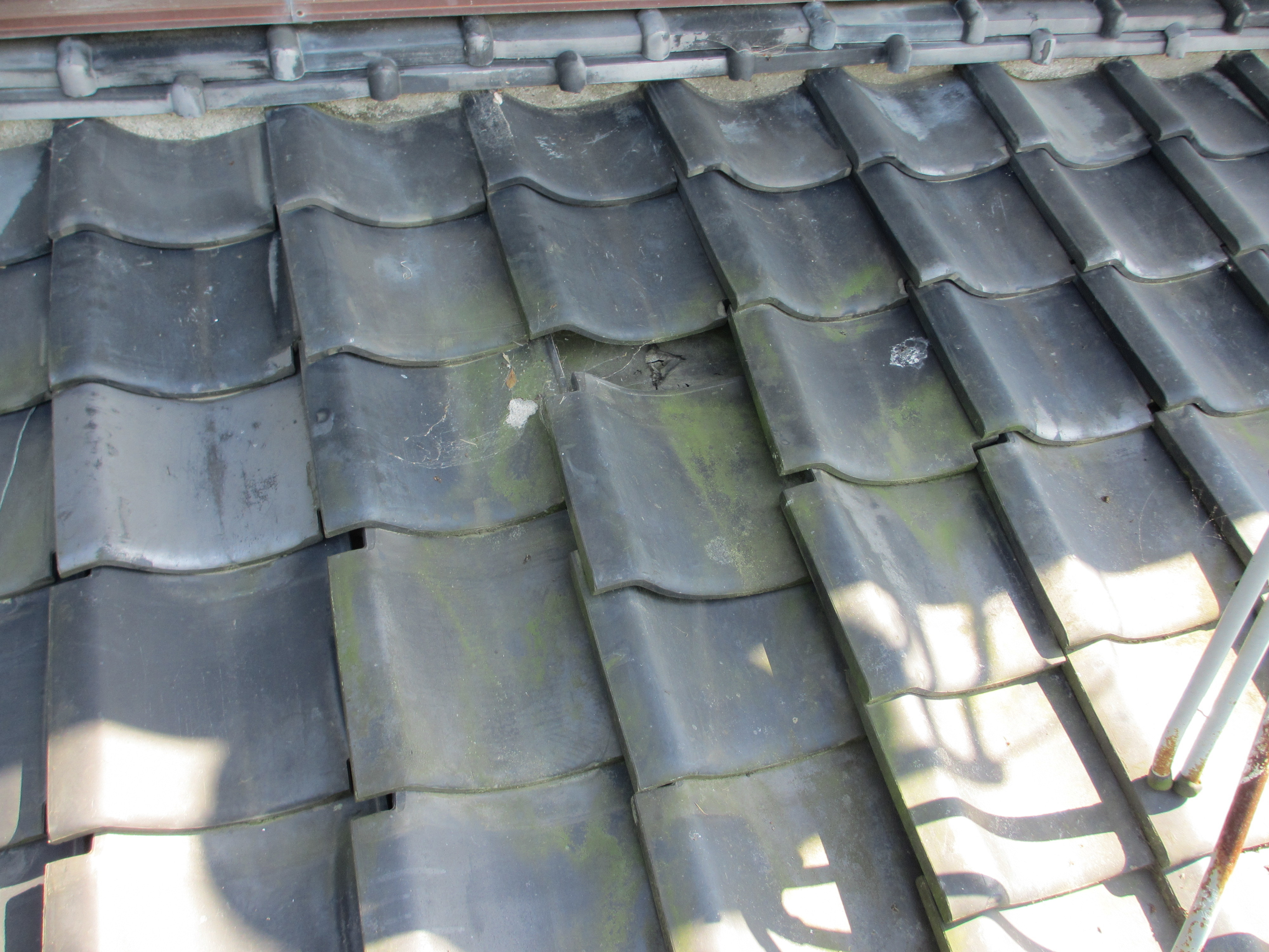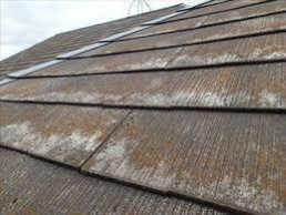 塗装が落ちて水切れが悪くなり苔やカビが生えている状態です。苔やカビは湿気のある所を好むので屋根に水分が溜まりやすくなっていることを示しています。常に水気があるということは屋根材を留めている釘の隙間や劣化したルーフィングの隙間から雨漏りする可能性が高まります。また、劣化した屋根材は強風や雹などに対する耐久性が低下しているので、破片が飛散したり二次災害につながる可能性を高めます。屋根を支えている野地板や垂木に漏水し躯体を腐食させてしまう前にメンテナンスをする必要があります。