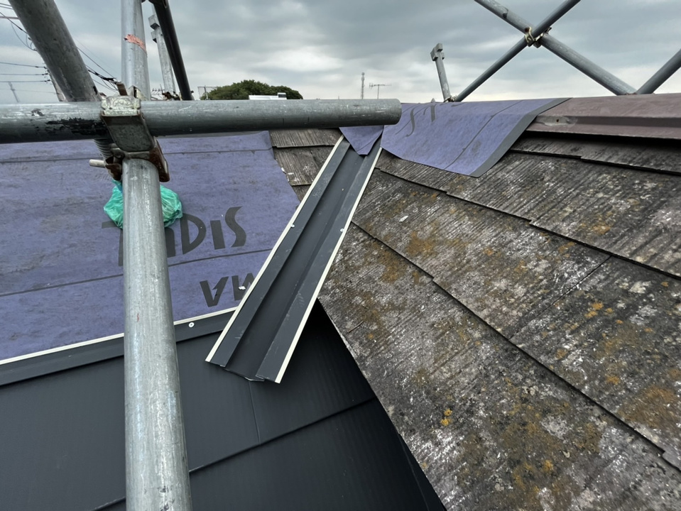 既存屋根材の上から二次防水のルーフィングを貼り、新しい屋根材のガルバリウム鋼板を上張りしているところです。谷の箇所は構造上複雑になっているので平場部に比べ雨漏りが多くなる箇所です。そのため板金加工には雨漏りさせないための雨仕舞を考え屋根の形状に合った施工をしなければなりません。また、カバー工法は既存屋根材の撤去や廃材処分費がかからない為、葺き替え工事に比べ安価に工事することが出来ると同時に、屋根が二重になることにより断熱防音効果が高まります。しかし既存屋根材を撤去しない分屋根の総量が重くなる為、地震に対して弱くなるデメリットが挙げられます。