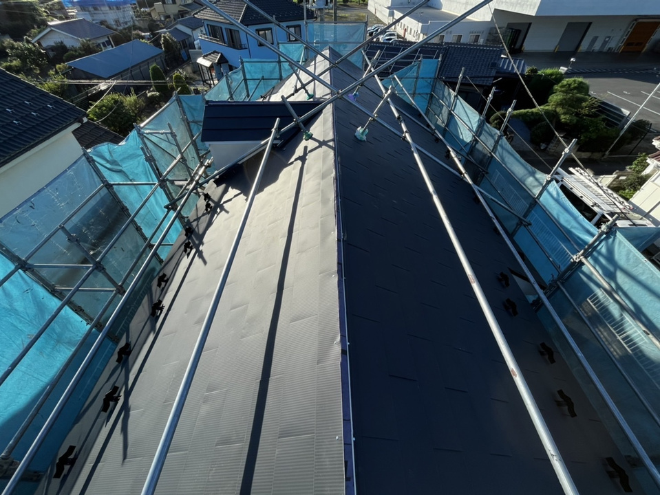 全ての屋根をガルバリウム鋼板で貼り終えた写真です。ガルバリウム鋼板には鋼板と断熱材が一体となった商品もあります。金属は熱伝導率が良く音を響かせやすいです。そのデメリットを解消したものが断熱材一体型のガルバリウム鋼板です。断熱材がある事により外部の熱や冷気、雨音や外部の騒音を弱め快適に暮らすことが出来るようになります。断熱材が無いものと比べると割高になってしまいますが長期的な目線で見れば価格よりメリットの方が上回る事でしょう。衝撃に弱いこともデメリットの一つに挙げられます。へこみなどに対する強度を上げるには鋼板の厚みが0.35mm以上の物を選ぶことをお勧めいたします。