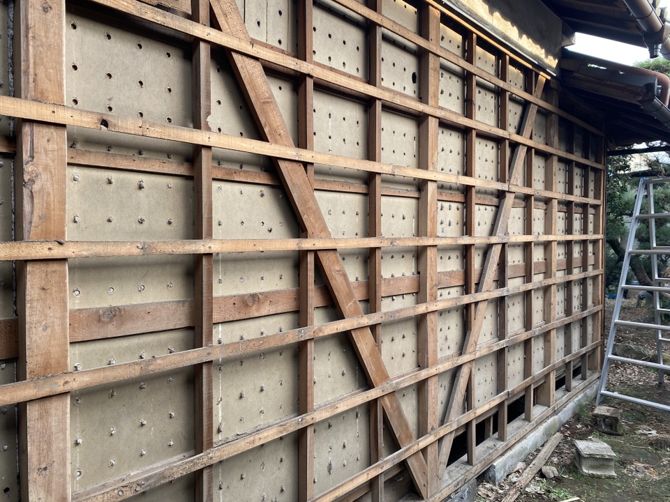 外壁の貼り替え工事の様子です。古くなった外壁と下地を剥がし、新しい外壁材を貼る準備をしているところです。家の骨組みが見えています。2022年11月2日に外壁を貼り終えました。